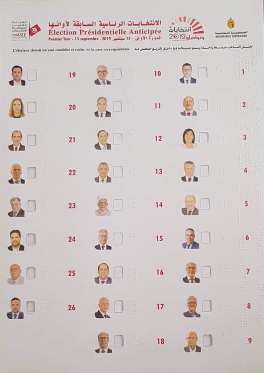 أعلنت الهيئة العليا المستقلة للانتخابات، اليوم الجمعة 20 سبتمبر 2019، أنها وضعت على ذمة الناخبين من ذوي الإعاقة البصرية، خلال الدورة الأولى من الانتخابات الرئاسية 2019، حافظة بطريقة " برايل " لتمكينهم من الانتخاب بدون مرافق.