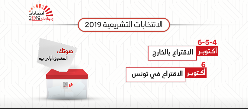 جدّدت الهيئة العليا المستقلة للانتخابات، اليوم الثلاثاء 24 سبتمبر 2019، التذكير بموعد الاقتراع للانتخابات التشريعية داخل الجمهورية الذي سيجرى يوم الأحد 6 أكتوبر 2019 .