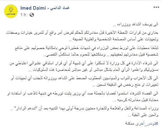 وأكد الدايمي في تدوينة على حسابه على فايسبوك أنه بلغته معطيات حول تورط وزراء في شبهات خطيرة توحي بإمكانية حصولهم على منافع شخصية قبيل مغادرتهم لحقيبتهم، مشدّدا على أنه سيكشفها للعموم.