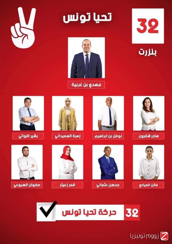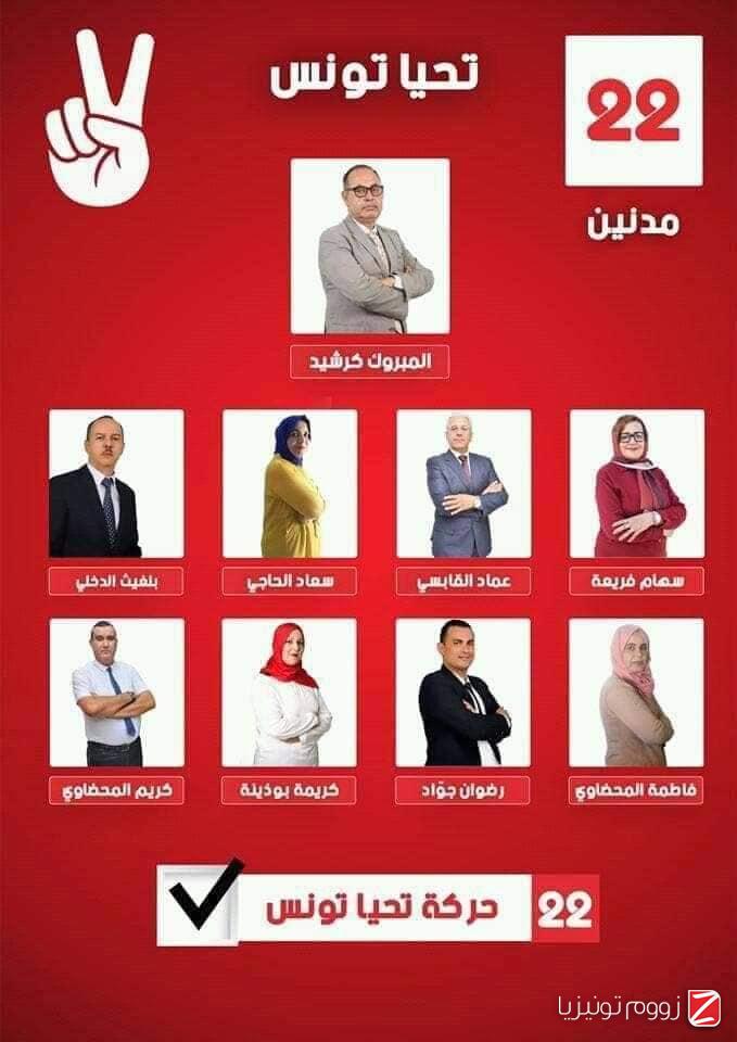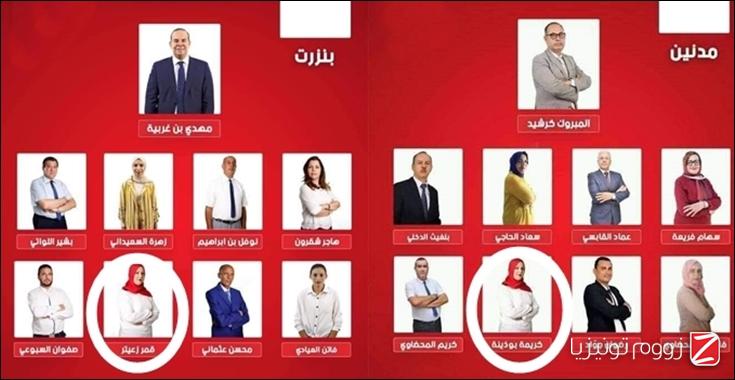 ويرأس قائمة مدنين مبروك كرشيد بينما يرأس قائمة بنزرت مهدي جمعة، مع 8 أعضاء لكل قائمة منهما، فيما تمّ ملاحظة وجود إمرأة بالقائمتين المرشحتين على دائرتين مختلفتين بأسماء مختلفة الشيء الذي أثار الاِستغراب والانتقاد.