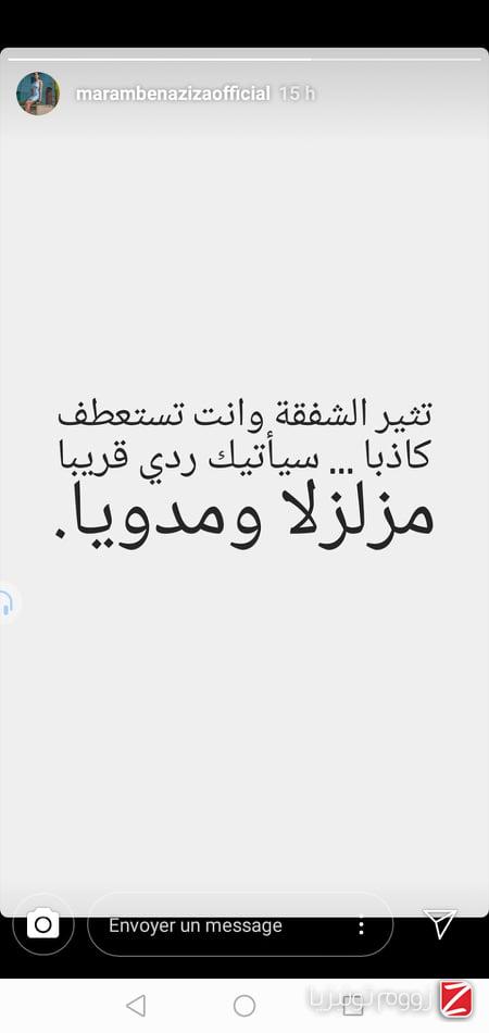 واِكتفت مرام بن عزيزة بنشر "حكاية" عبر حسابه الخاص على "الانستغرام" قالت فيها أنّ ردّها سيكون مزلزلاً ومدويًا، مُتابعة "تثير الشفقة وانت تستعطف كاذبا ..سيأتيك ردي قريبًا".