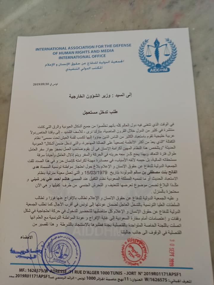 وطالبت الجمعية وزارة الشؤون الخارجية بالتدخل العاجل لضمان عودة "هدى بن سالم" إلى تونس، مؤكدة في نص المراسلة أنّ الأخيرة تواصلت مع القنصلية التونسية بجدة إلا أنه طُلب منها الاستنجاد بالشرطة، ما اعتبرته الجمعية تقصيرا من طرف القنصلية التونسية.