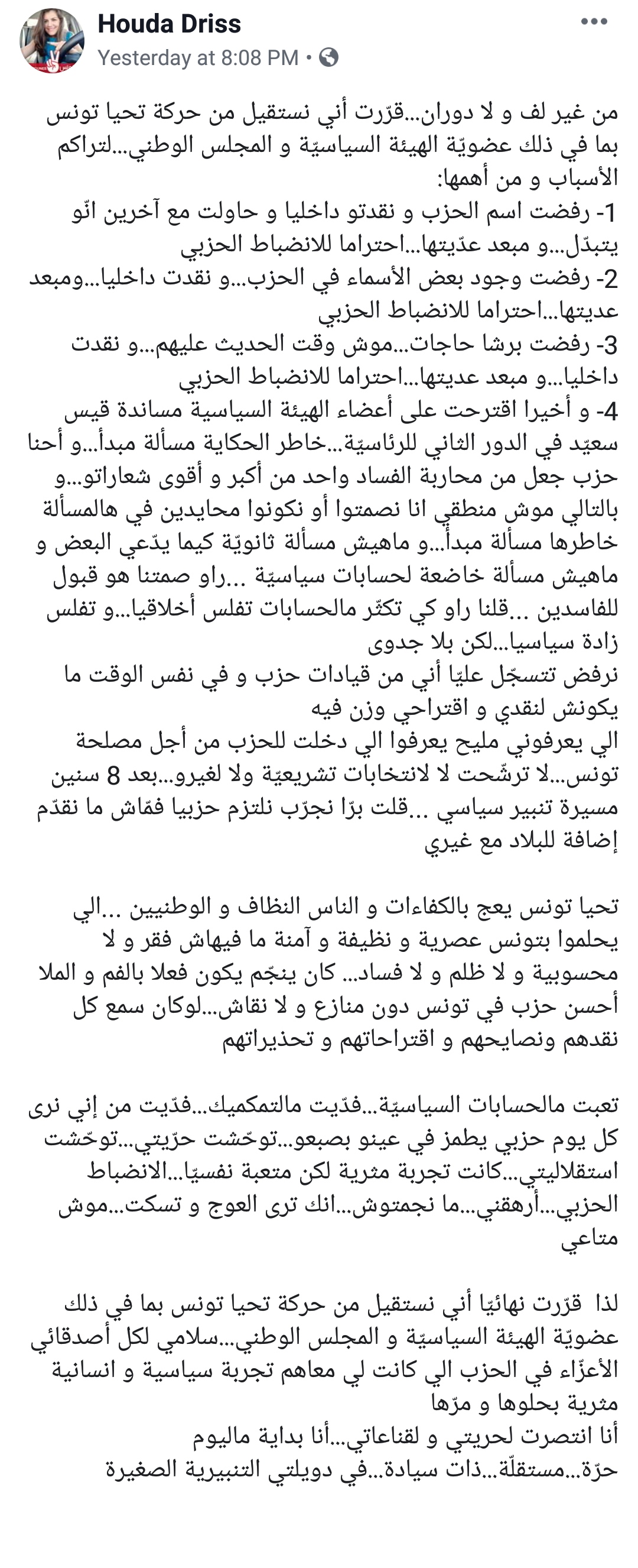 وقالت ادريس، في تدوينة نشرتها على حسابها الشخصي بموقع التواصل الاجتماعي "فايسبوك"، أنها اقترحت دعم قيس سعيد في الدور الثاني من الانتخابات الرئاسية ولم يتم أخد اقتراحها بعين الاعتبار موضحة ان تتابع ذلك جعلها تشعر أنها لا تملك وزن داخل الحركة التي اتهمتها بالتعنت وعدم المرونة والحسابات السياسية.