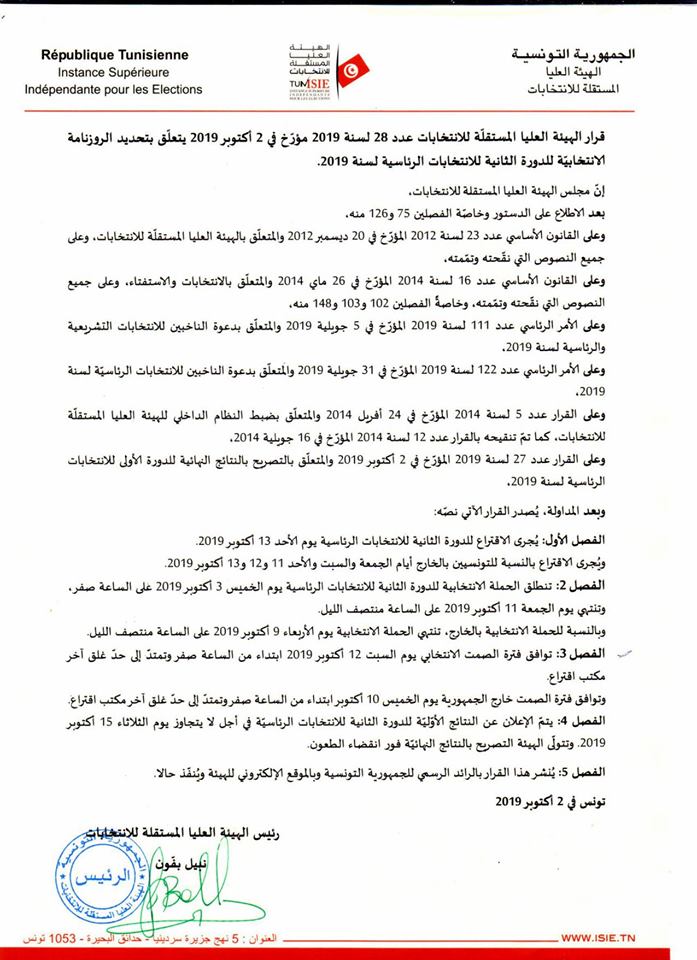 وتدور الانتخابات الرئاسية في دورها الثاني بين المترشحين نبيل القروي وقيس سعيد، وذلك بعد استيفاء مرحلة البت في الطعون.