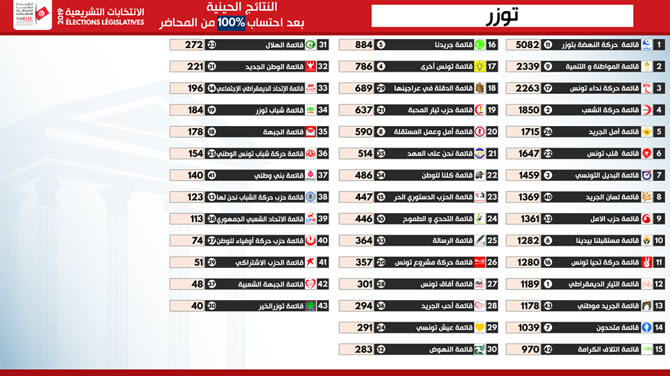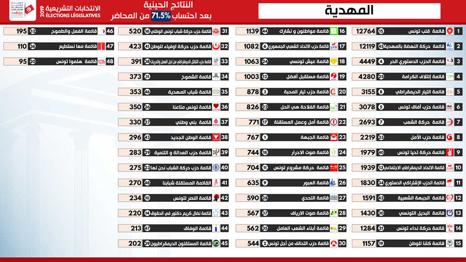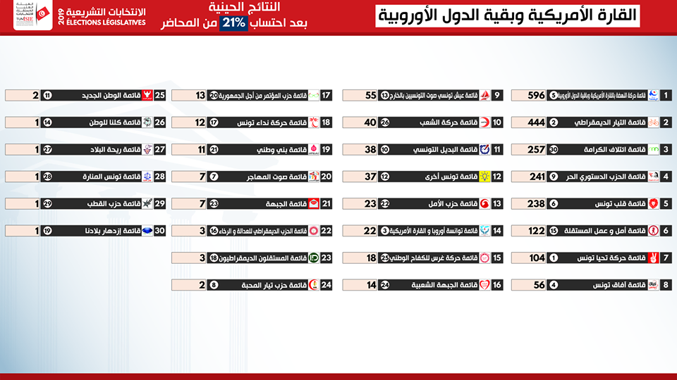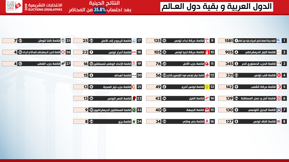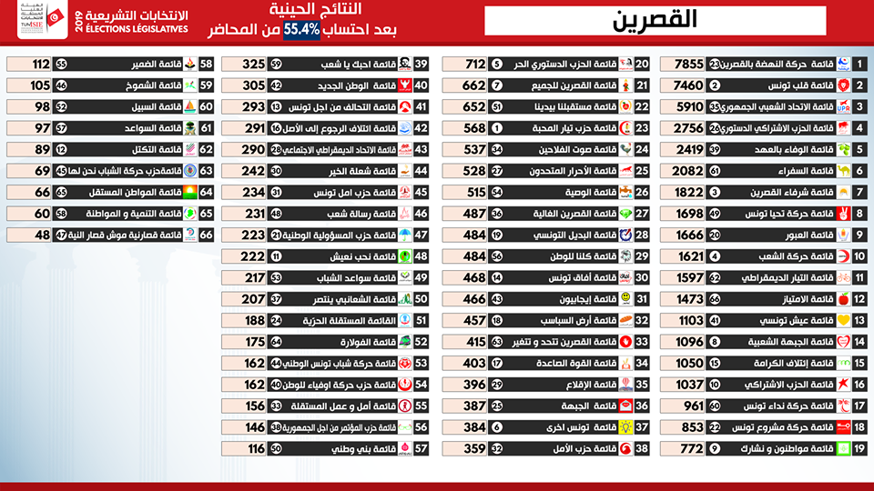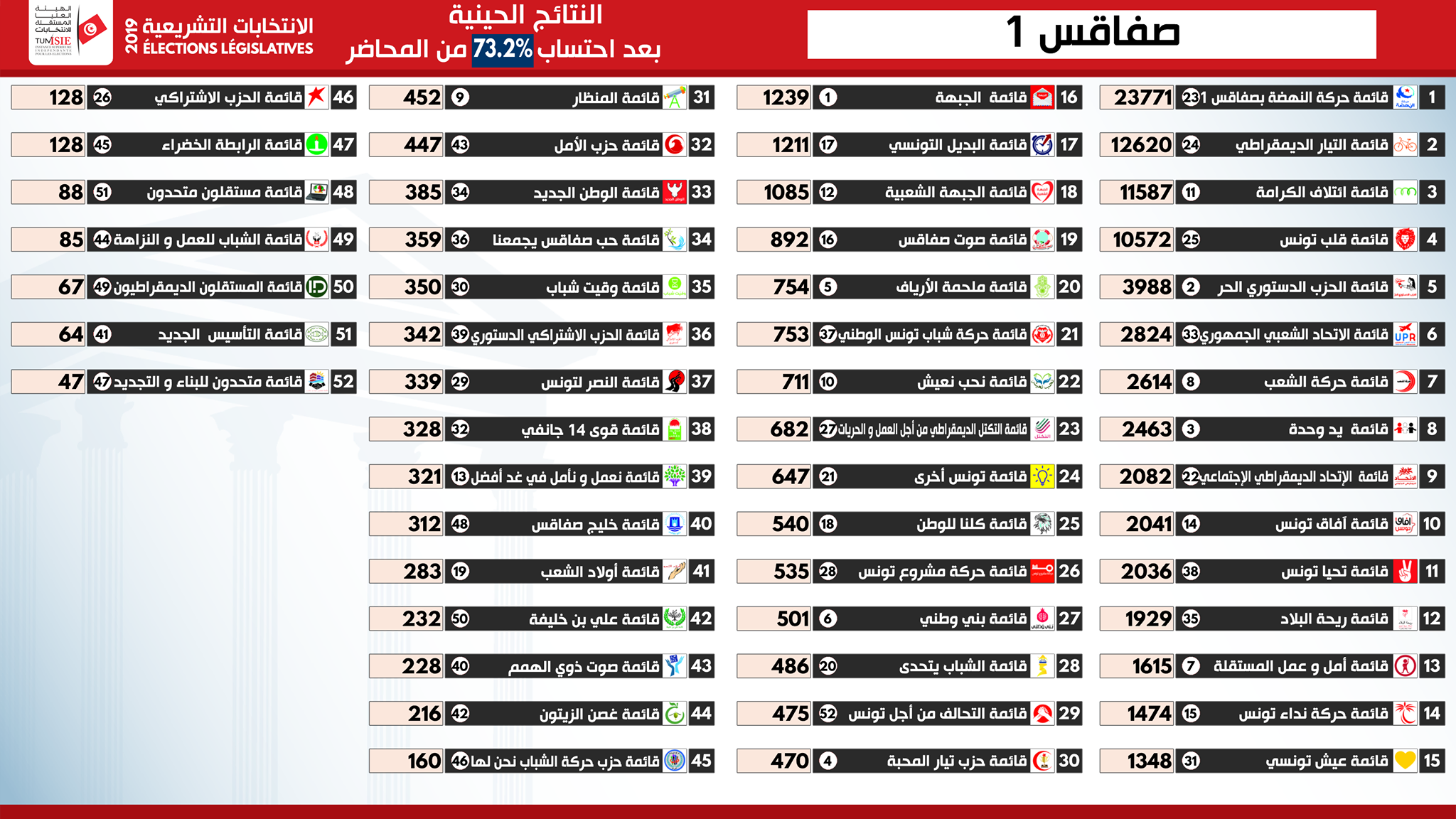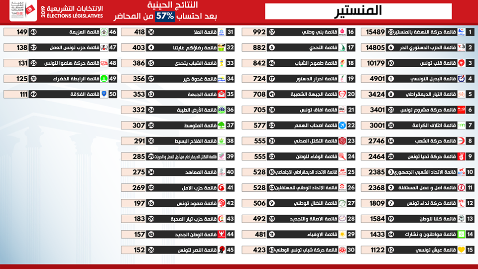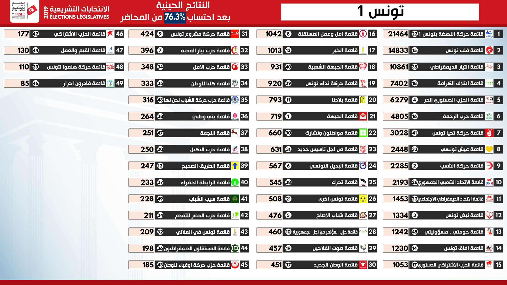 نشرت الهيئة العليا المستقلة للانتخابات، اليوم الاثنين 07 أكتوبر 2019، النتائج الحينية للانتخابات التشريعية داخل وخارج أرض الوطن.