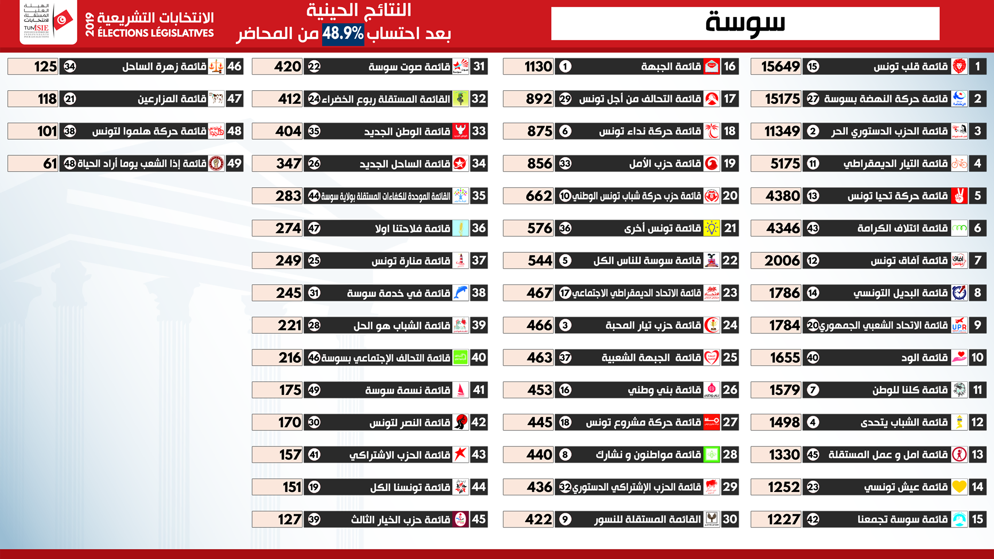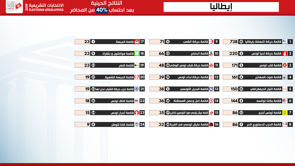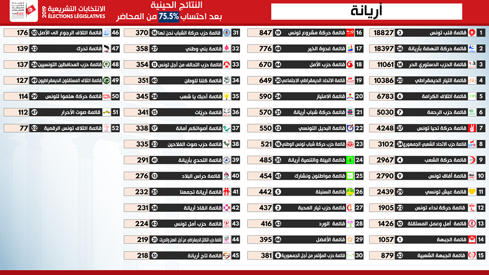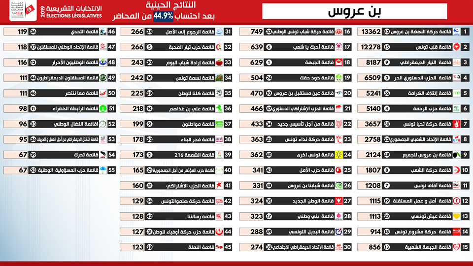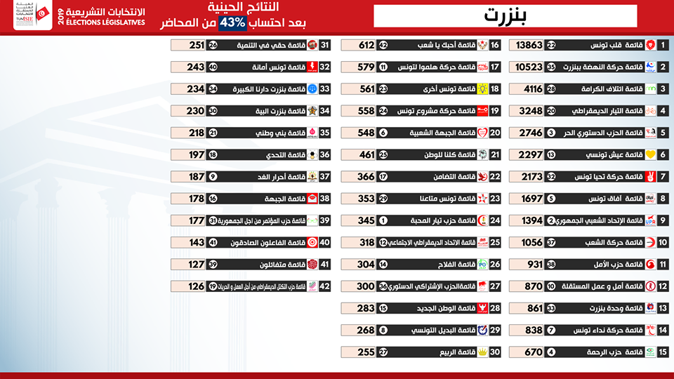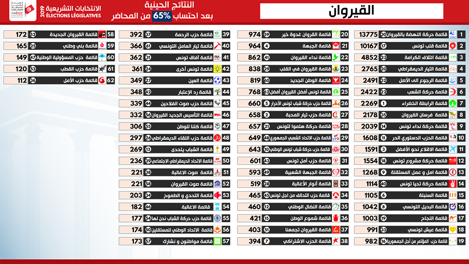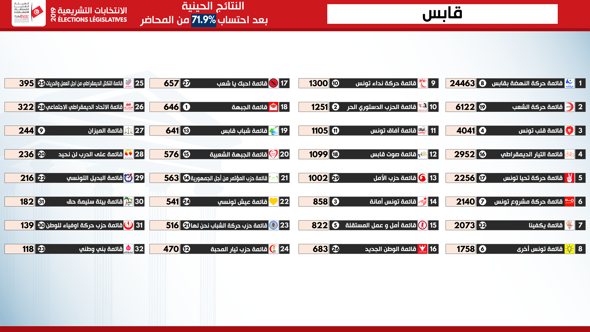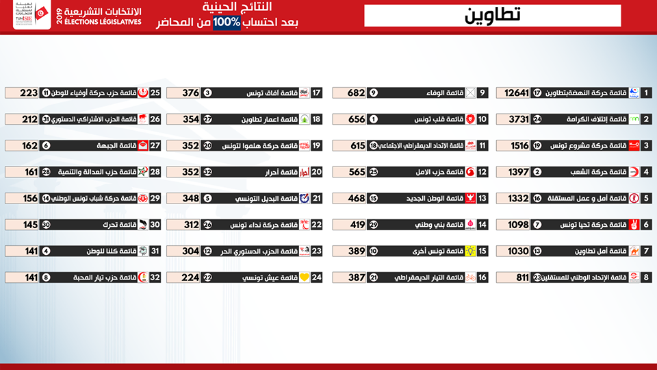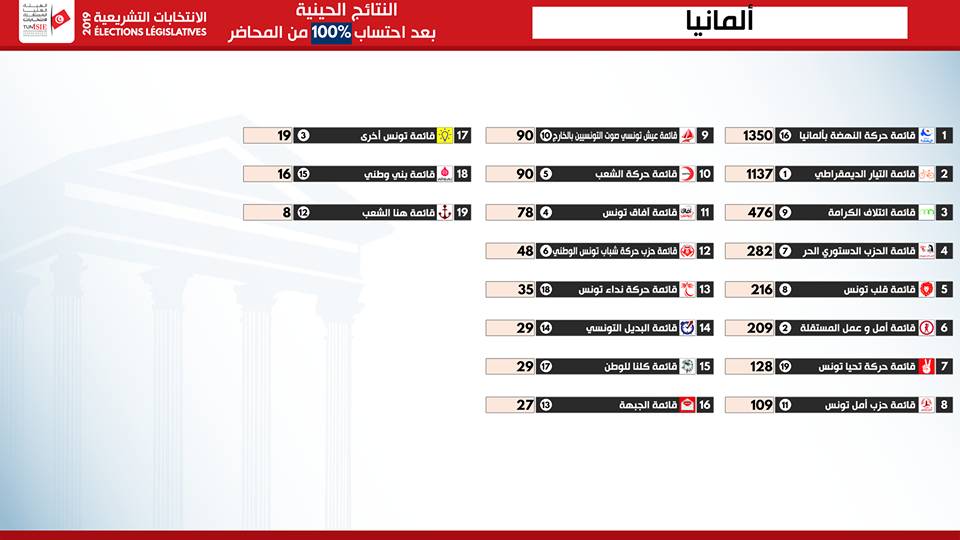 نشرت الهيئة العليا المستقلة للانتخابات، اليوم الاثنين 07 أكتوبر 2019، النتائج الحينية للانتخابات التشريعية داخل وخارج أرض الوطن.