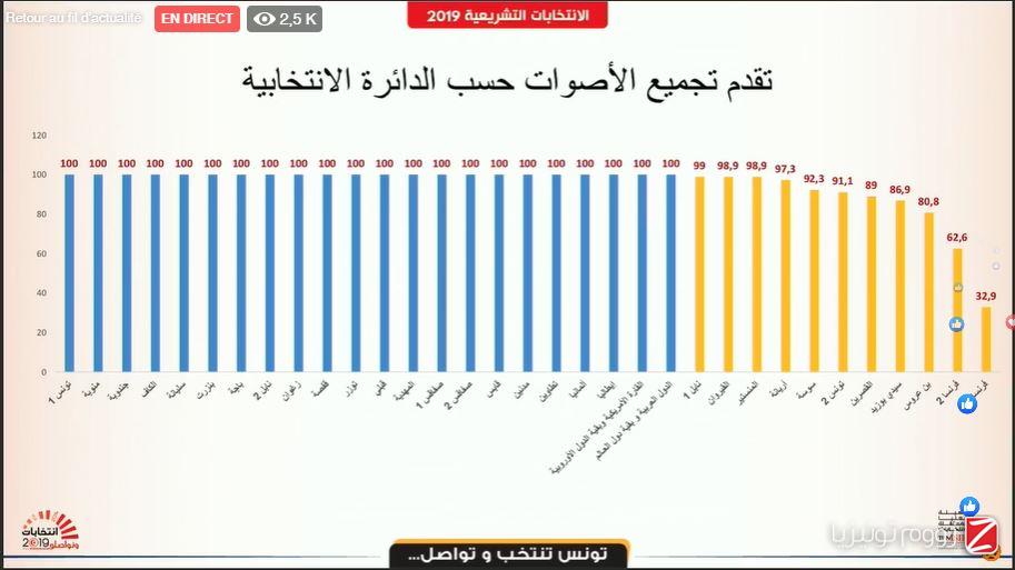 وقالت الهيئة ، خلال ندوة صحفية حول سير عملية تجميع النتائج، أنّ هنالك 22 دائرة تمّ اِستكمال الفرز فيها وهي كل من تونس1، منوبة، جندوبة، الكاف، سليانة، بنزرت، باجة، نابل 2، زغوان، قفصة، توزر، قبلي، المهدية، صفاقس 1، صفاقس 2، قابس، مدنين، تطاوين، ألمانيا، إيطاليا، القارة الأمريكية وبقية الدول الأوروبية، الدول العربية وبقية دول العالم.