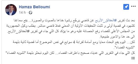 وعبّر البلومي في تدوينة نشرها على صفحته على الفايسبوك عن استغرابه من اتهامهم "بتشويه القضاء" رغم أنه التحقيقات الأولية أثبتت أنّ ما تم بثه في البرنامج "صحيح باعتراف القضاء" وأنّ القاضي المعني بالقضية هو فعلا قاضي مباشر، خاصة وأنّ وكيل الجمهورية من المجلس الأعلى للقضاء طلب رفع الحصانة عليه، بعد فتح تحقيق في ما تم بثه في البرنامج المذكور.