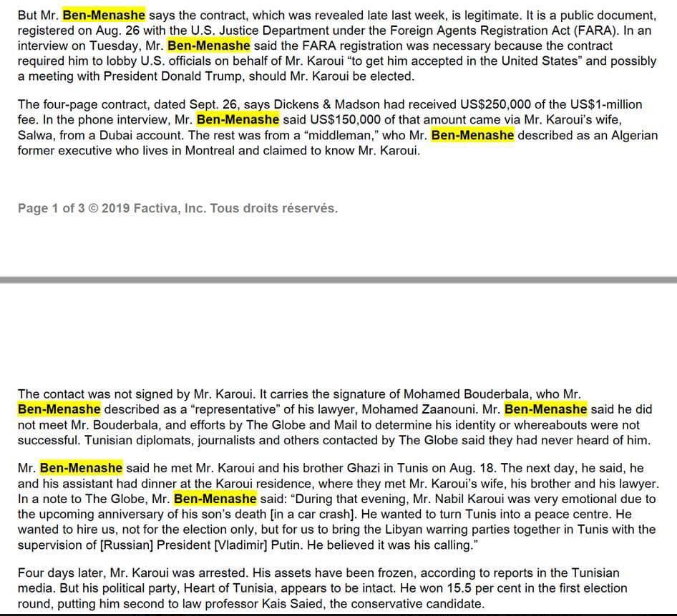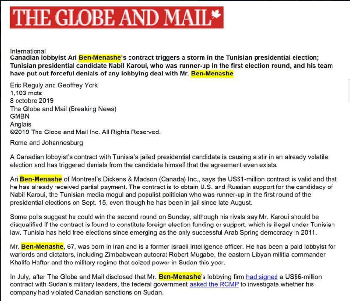 يشار إلى أنه تمّ تداول أخبار، قبل أيام من الانتخابات التشريعية، تُفيد بأنّ المترشّح للدور الثاني من الانتخابات الرئاسية، نبيل القروي، تعاقد مع شركة "لوبيينغ" كندية على ملك ضابط سابق في المخابرات الاسرائيلية بهدف مساعدته لاجراء لقاءات مع كبار المسؤولين في روسيا والولايات المتحدة الأمريكية لدعمه في الانتخابات.