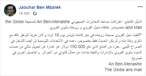 وكان جوهر بن مبارك قد نشر على صفحته الرسمية بموقع التواصل الاجتماعي "فايسبوك"، اعترافات ضابط المخابرات الصهيوني "آري بن ميناشي" لصحيفة the Globe and Mail بخصوص علاقته بنبيل القروي و زوجته سلوى القروي ووصفها بـ"الدليل القاطع"، وفق تعبيره.