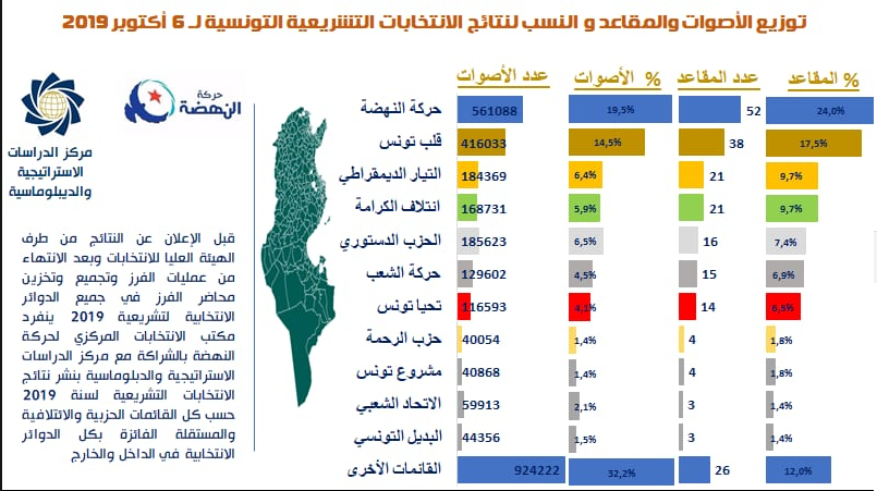نشرت حركة النهضة، اليوم الأربعاء 09 أكتوبر 2019، النتائج النهائية للانتخابات التشريعية باحتساب عدد الأصوات والنسبة المائوية وباحتساب عدد المقاعد.