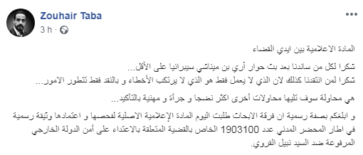 أكّد الصحفي التونسي المقيم بكندا، زهير طابا، أن فرقة الأبحاث طلبت اليوم الجمعة 11 أكتوبر 2019 المادة الإعلامية الأصلية للحوار الذي أجراه مع الصهيوني، آري بن ميناشي حول علاقته بالمرشح للانتخابات الرئاسية، نبيل القروي، لفحصها و اعتمادها وثيقة رسمية في اطار المحضر المدني عدد 1903100 الخاص بالقضية المتعلقة بالاعتداء على أمن الدولة الخارجي المرفوعة ضدّ القروي.