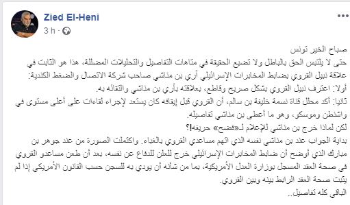 وأشار الهاني إلى اعتراف القروي بشكل صريح وقاطع، بعلاقته بآري بن مناشي والتقائه به، مذكّرا بتصريح محلّل قناة نسمة خليفة بن سالم، أن القروي قبل إيقافه كان يستعد لإجراء لقاءات على أعلى مستوى في واشنطن وموسكو، وهو ما أعطى بن مناشي تفاصيله في الحوار الذي تم تسريبه.