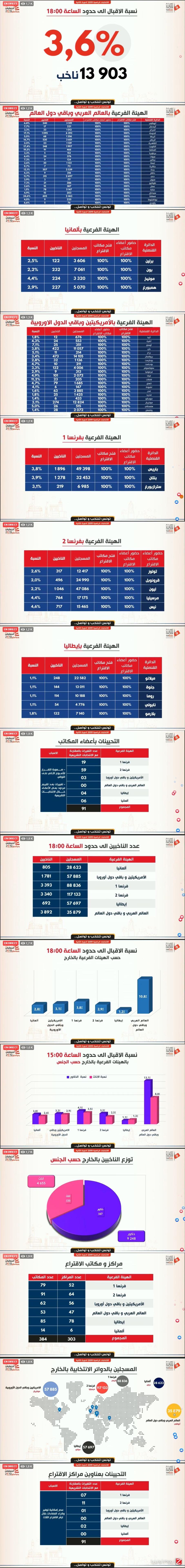 وأكّدت الهيئة في ندوة صحفية حول مستجدات الاقتراع بالخارج أنّ نسبة الإقبال إلى حدود الساعة السادسة مساءً هي 3.6%.