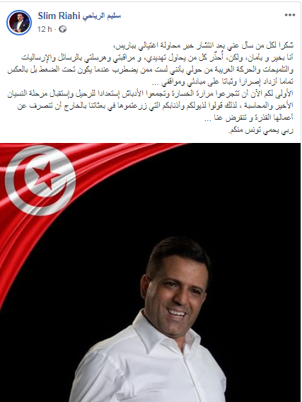 ونشر سليم الرياحي تدوينة عبر حسابه الرسمي على موقع التواصل الاجتماعي "فايسبوك"، تقدّم فيها بالشكر لكلّ من سأل عنه بعد انتشار خبر محاولة اغتياله.