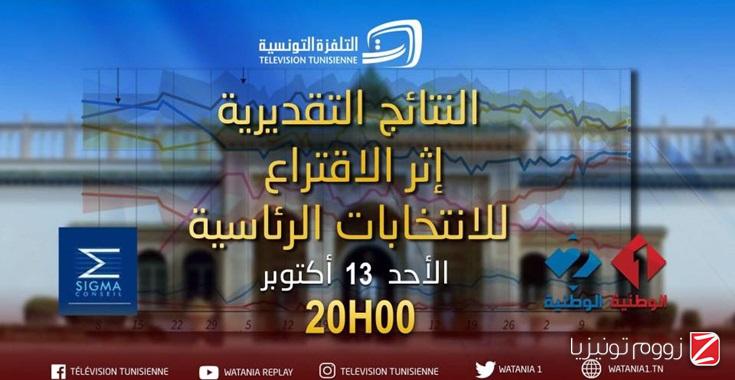 تقدّم القناة الوطنية الأولى غدا الأحد 13 أكتوبر 2019، على الساعة الثامنة ليلا، النتائج الأولية للدور الثاني لانتخابات الرئاسية إثر الاقتراع، بالتعاون مع شركة سيغما كونساي، وفق ما أعلنه مدير الاتصال بالتلفزة التونسية إلياس جراية على صفحته على فايسبوك.