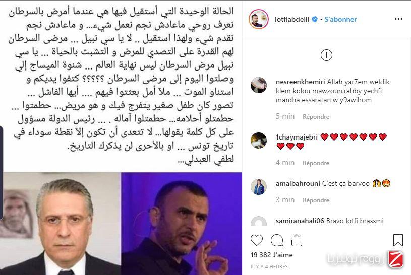 وتابع لطفي العبدلي "مرض السرطان ليس نهاية العالم"، مُضيفًا مُخاطبًا نبيل القروي أنّ رسالته لهؤلاء المرصى كانت كالتالي "كتفوا ايديكم واستناو الموت".