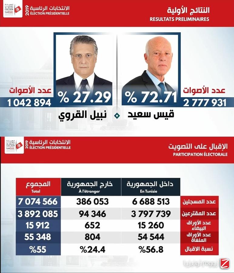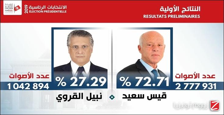 وقد فاز المرشّح المستقل قيس سعيّد على مُنافسه عن قلب تونس نبيل القروي ، حيث كانت النتائج كالتالي :