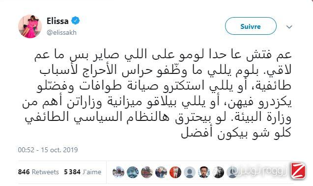 وكتبت اليسا في حسابها على تويتر: "عم فتش عا حدا لومو على اللي صاير بس ما عم لاقي. بلوم يللي ما وظّفو حراس الأحراج لأسباب طائفية، أو يللي استكترو صيانة طوافات وفضّلو يكزدرو فيهن، أو يللي بيلاقو ميزانية وزاراتن أهم من وزارة البيئة. لو بيحترق هالنظام السياسي الطائفي كلو شو بيكون أفضل".