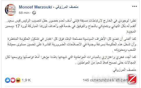 وأضاف المرزوقي ، في تدوينة له علـى صفحته الرسميّة بـ"الفايسبوك"، أنّ ذلك يعود لكونه متواجد خارج تونس لارتباطات مسبقة، مُتمنيًا له التوفيق في خدمة قيم وأهداف الثورة.