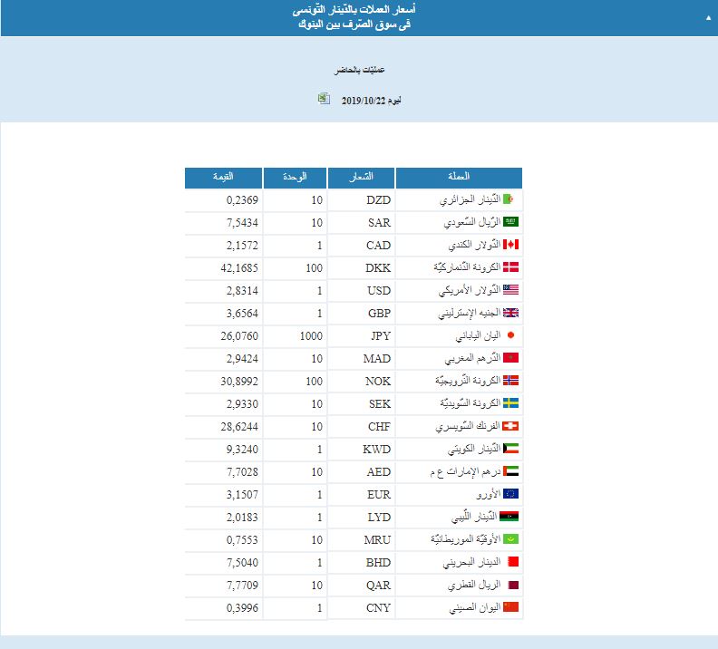 وفي ما يلي أسعار بقية العملات بالدّينار التّونسي في سوق الصّرف بين البنوك:
