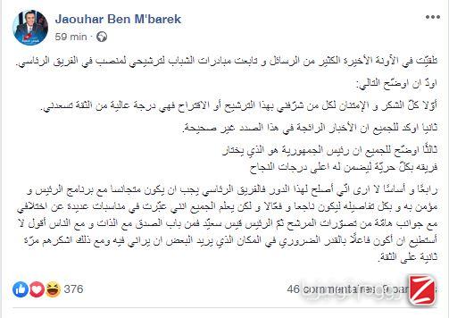 وقال بن مبارك ، في تدوينة علـى حسابه الشخصي بـ"الفايسبوك"، أنّ الأخبار الرائجة في هذا الصدد غير صحيحة، مُوضّحًا أنّ رئيس الجمهورية هو الذي يختار فريقه بكلّ حريّة ليضمن له اعلى درجات النجاح.