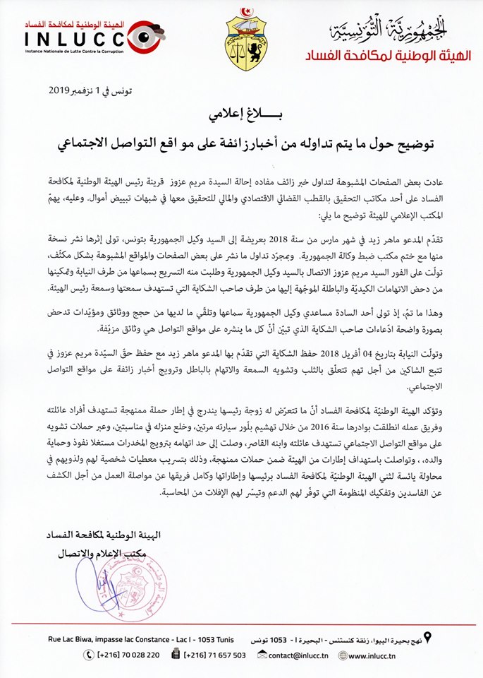 أكّدت الهيئة الوطنيّة لمكافحة الفساد، اليوم الجمعة 01 نوفمبر 2019، أن الأخبار الرائجة المتعلقة بإحالة قرينة رئيس الهيئة على أحد مكاتب التحقيق بالقطب القضائي الاقتصادي والمالي للتحقيق معها في شبهات فساد وتبيض أموال، لا أساس لها من الصحة.