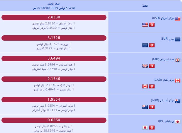 أسعار العملة بالدينار التونسي اليوم الثلاثاء 05 نوفمبر 2019
