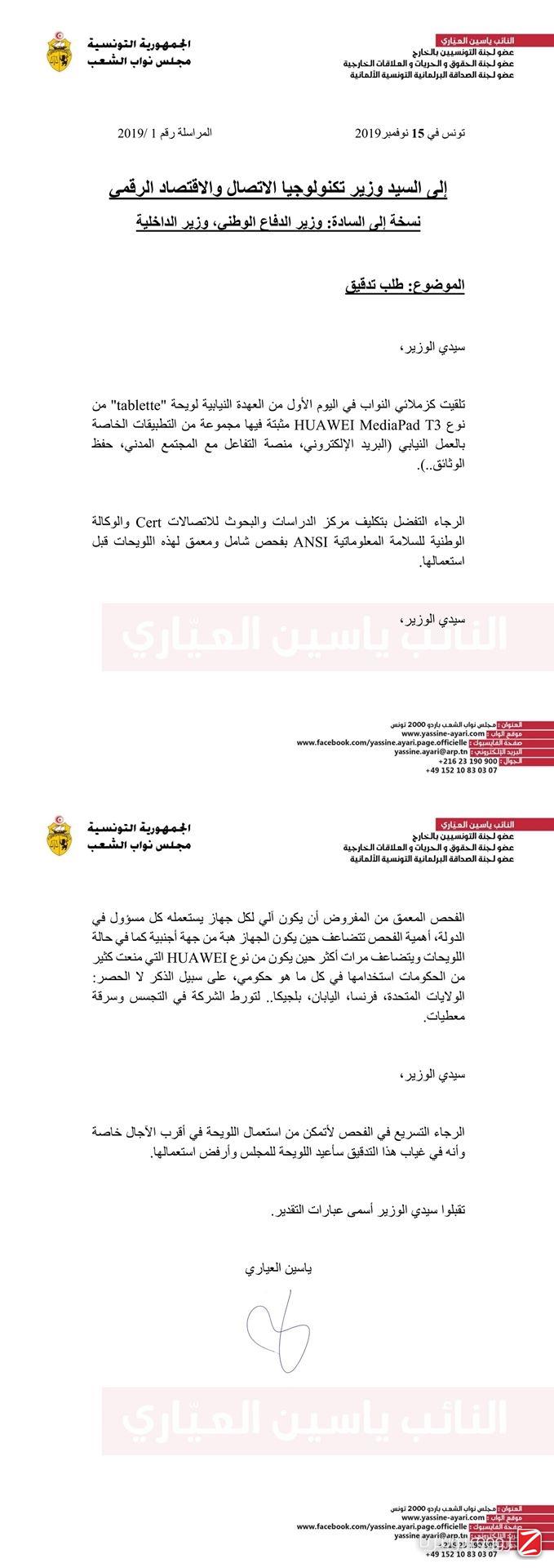 وطلب النائب بتكليف مركز الدراسات والبحوث للاتصالات والوكالة الوطنية للسلامة المعلوماتية بفحص شامل ومعمق لهذه اللويحات قبل استعمالها، مُشيراً إلـى "أنّ الفحص المعمق من المفروض أن يكون آلي لكل جهاز يستعمله كل مسؤول في الدولة، أهمية الفحص تتضاعف حين يكون الجهاز هبة من جهة أجنبية كما في حالة اللويحات ويتضاعف مرات أكثر حين يكون من نوع HUAWEI التي منعت كثير من الحكومات استخدامها في كل ما هو حكومي لتورط الشركة في التجسس وسرقة معطيات".