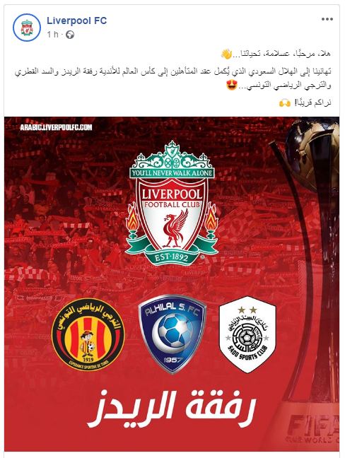 ورحب ليفربول بالأندية العربية المشاركة في كأس العالم للأندية وهي : الترجي، السد القطري و الهلال السعودي.