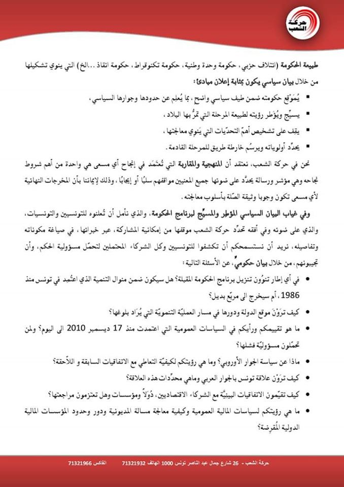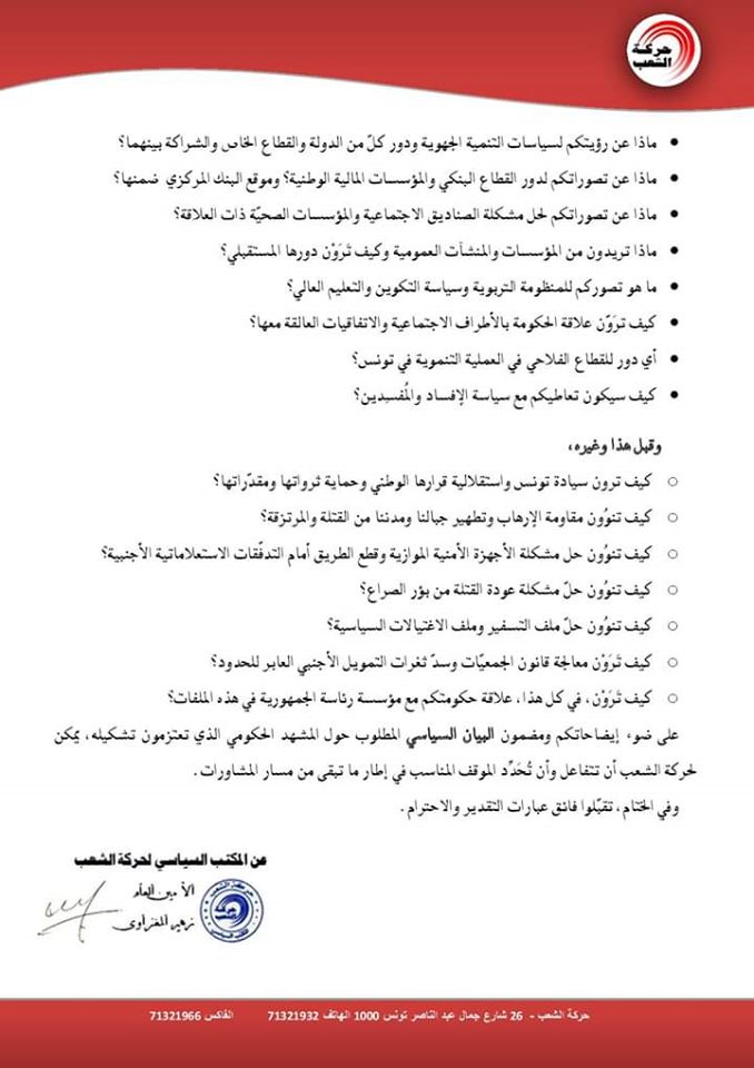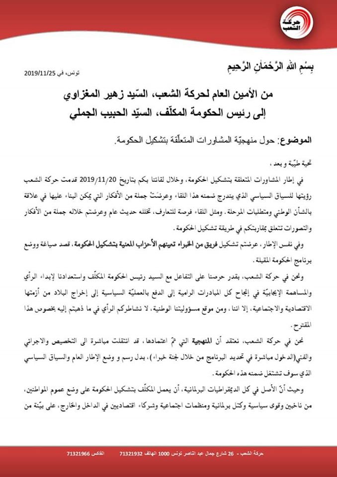 وطالب المكتب السياسي للحركة في مراسلة وجّهها إلى رئيس الحكومة المكلف، الحبيب الجملي، بصياغة بيان سياسي من شأنه أن يؤطر برنامج الحكومة، يتضمن رؤية رئيس الحكومة المكلف لعدة مسائل تخص الخيارات السياسية والاقتصادية والاجتماعية.