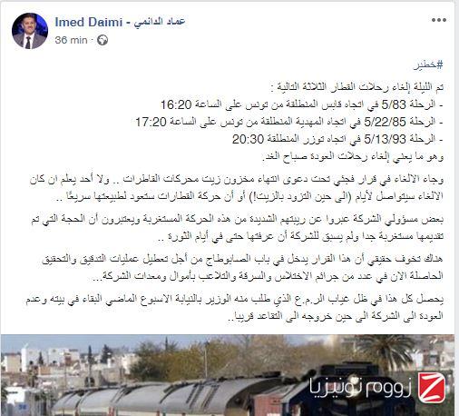 وقال الدايمي ، عبر حسابه الشخصي علـى "الفايسبوك"، أنّ هذا القرار الفجئي والخطير جاء تحت دعوى انتهاء زيت محركات القاطرات ولا أحد يعلم ان كان الإلغاء سيتواصل لأيّام أو أنّ حركة القطارات ستعود لطبيعتها سريعًا.
