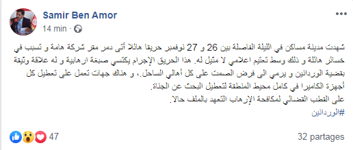 وقال سمير بن عمر، في تدوينة نشرها عبر صفحته على موقع التواصل الاجتماعي "فايسبوك"، أن هذا الحريق يكتسي صبغة ارهابية ويرمي إلى فرض الصمت على كل أهالي الساحل، وفق تعبيره.