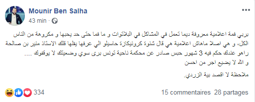 هذا ولم يذكر المحامي منير بن صالحة، إسم الإعلامية التي تحدّث عنها في نص تدوينته التي قام بتعديلها فيما بعد مضيفًا ملاحظة " أنا لا أقصد بيّة الزردي".