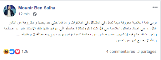ودعا منير بن صالحة، من خلال تدوينة نشرها عبر صفحته على موقع التواصل الاجتماعي "فايسبوك"، هذه الإعلامية، إلى تسوية وضعيّتها قبل أن يتمّ إيقافها.