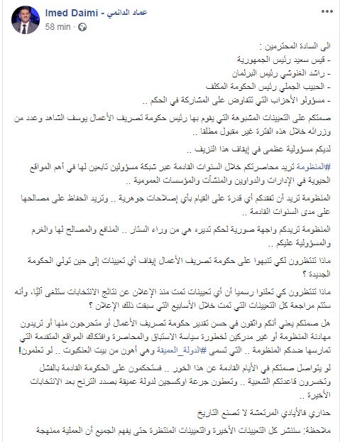 وطالب الدايمي كل من رئيس الجمهورية قيس سعيد، ورئيس البرلمان راشد الغنوشي، ورئيس الحكومة المكلف الحبيب الجملي، بإلغاء كل التعيينات التي تمت منذ الإعلان عن نتائج الانتخابات، و مراجعة التعيينات التي تمت خلال الأسابيع التي سبقت نتائج الانتخابات.