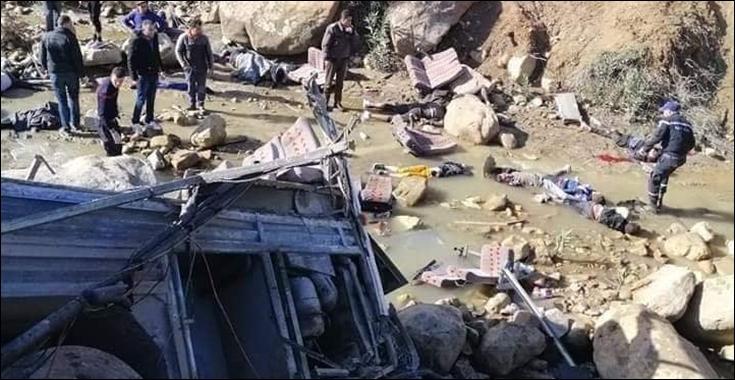 وتتمثل صورة الحادث في سقوط حافلة، تابعة لاحد وكلات الاسفار الخاصة، كانت تقل 43 شخصا في اطار رحلة سياحية ترفيهية من تونس العاصمة في اتجاه عين دراهم، في مجرى وادي بعد تجاوزها لحاجز حديدي، وفق بلاغ وزارة الداخليّة.