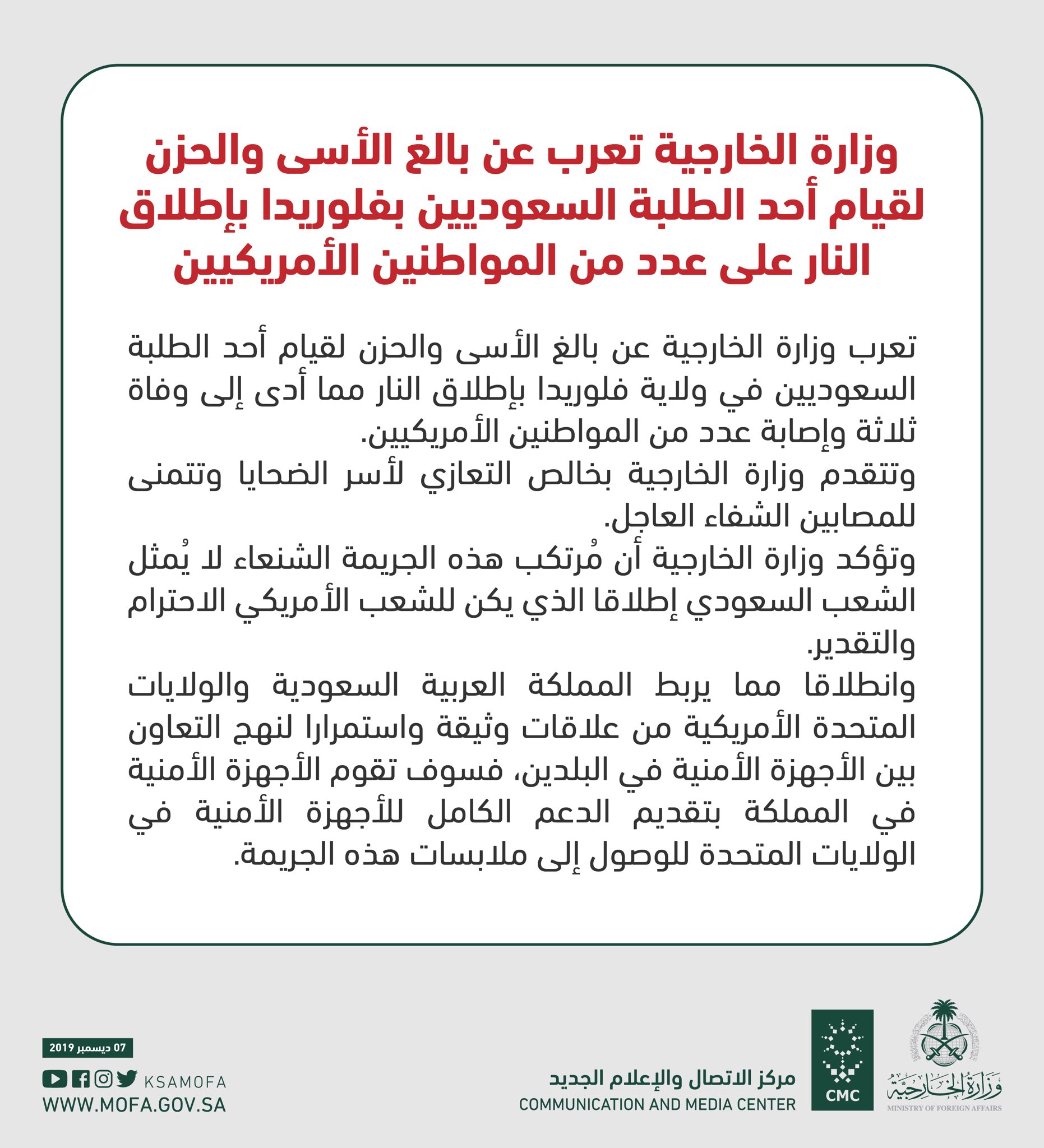 هذا وأعربت وزارة الخارجية السعودية عن بالغ الأسى والحزن لقيام أحد الطلبة السعوديين في ولاية فلوريدا بإطلاق النار.