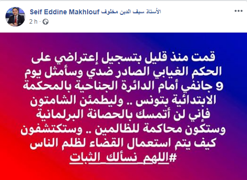 يذكر أنّ الدائرة الجناحية السادسة بالمحكمة الابتدائية بتونس، قد أصدرت يوم الجمعة 13 ديسمبر الجاري، حكمًا بالسجن لمدّة عام و8 أشهر ضدّ سيف الدين مخلوف.