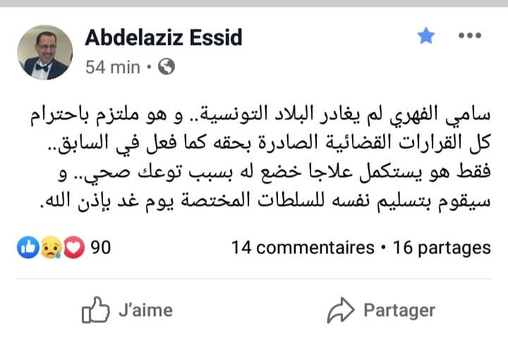 وفي نفس السياق أكّد محامي الفهري عبد العزيز الصيد عبر تدوينة له على الفايسبوك أنّ موكّله ملتزم باحترام كل القرارات القضائيّة الصادرة في حقّه.