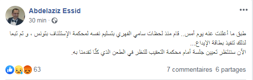 وأضاف المحامي، في تدوينة نشرها عبر صفحته على موقع التواصل الاجتماعي "فايسبوك"، أنه في انتظار تعيين جلسة أمام محكمة التعقيب للنظر في الطعن الذي تقدم به.
