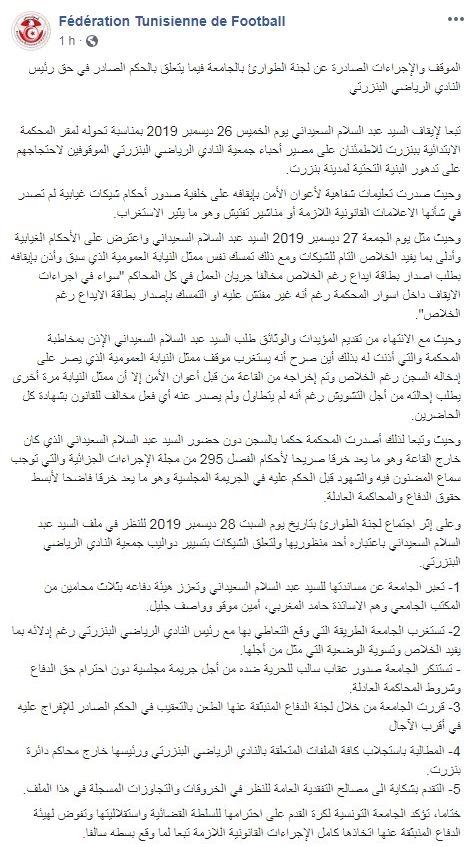 هذا وقرّرت الجامعة من خلال لجنة الدفاع المنبثقة عنها الطعن بالتعقيب في الحكم الصادر للإفراج عليه في أقرب الآجال، وطالبت باستجلاب كافة الملفات المتعلقة بالنادي الرياضي البنزرتي ورئيسها خارج محاكم دائرة بنزرت.