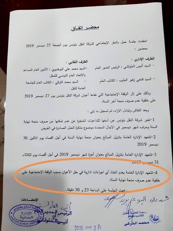 هذا وحرص الطرف النقابي على أن تنص النقطة الأخيرة في محضر الاِتفاق على تعهّد الإدارة العامّة بعدم اِتخاذ أيّة إجراءات إدارية في حق الأعوان بسبب هذه الحركة الاحتجاجية.