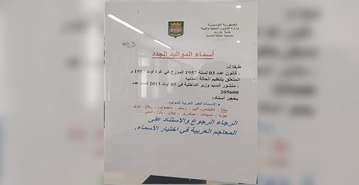 تداول رواد مواقع التواصل الاجتماعي معلقة ببلدية بنزرت تمنع تسمية المواليد الجدد أسماء غير عريية.