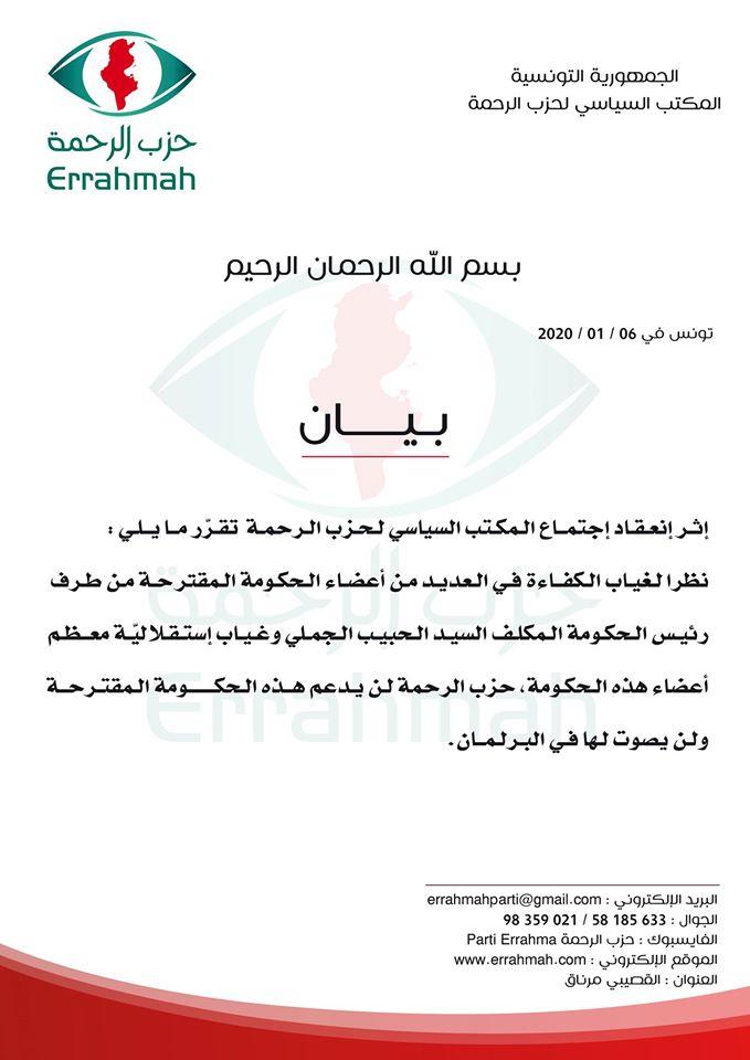 وكان موضوع هذا الاجتماع المصادقة على حكومة الجملي من عدمها و الذي تقرّر فيه عدم دعم الحزب لهذه الجكومة و عدم التصويت لها في جلسة الجمعة 10 جانفي 2020.