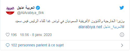 وأعلنت قناة العربية في تغريدة على تويتر، أن الوزيران سيلتقيان خلال هذه الزيارة رئيس الجمهورية قيس سعيّد.