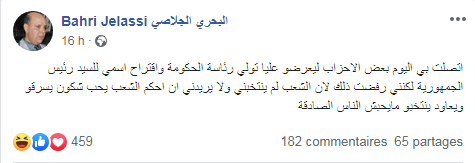 وأوضح الجلاصي، في تدوينة نشرها عبر صفحته الرسمية على موقع التواصل الاجتماعي "فايسبوك"، أنه رفض ترشيحه لمنصب رئيس الحكومة.