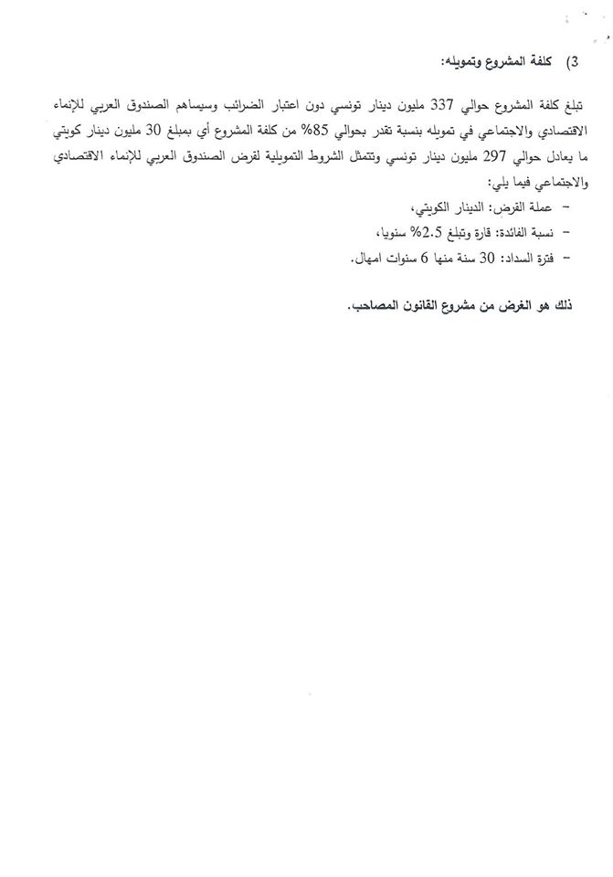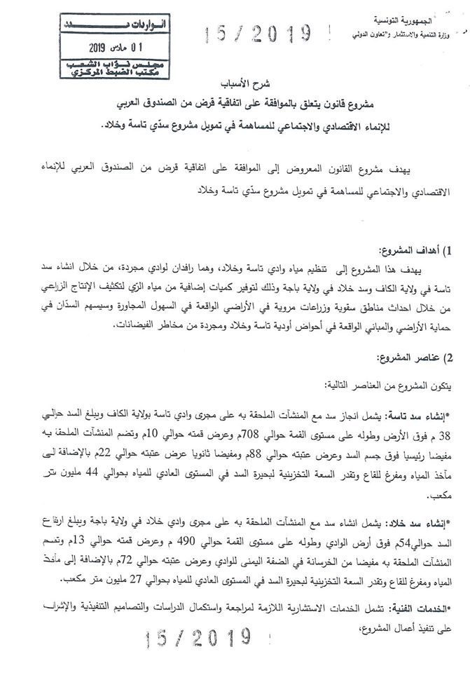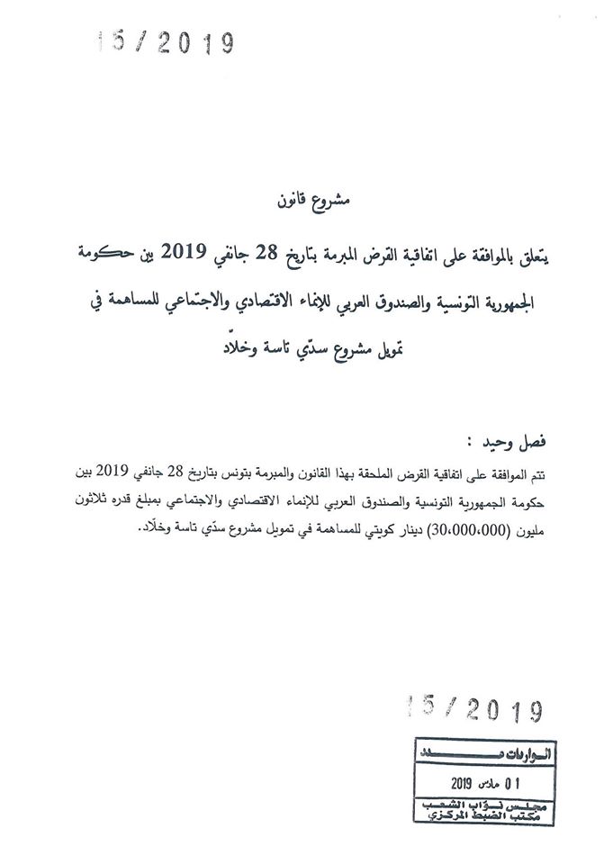 والاتفاقية مبرمة في 28 جانفي 2019 بين حكومة الجمهورية التونسية والصندوق العربي للانماء الاقتصادي والاجتماعي للمساهمة في تمويل مشروع سدي تاسة في ولاية الكاف و خلاد في ولاية اجة.