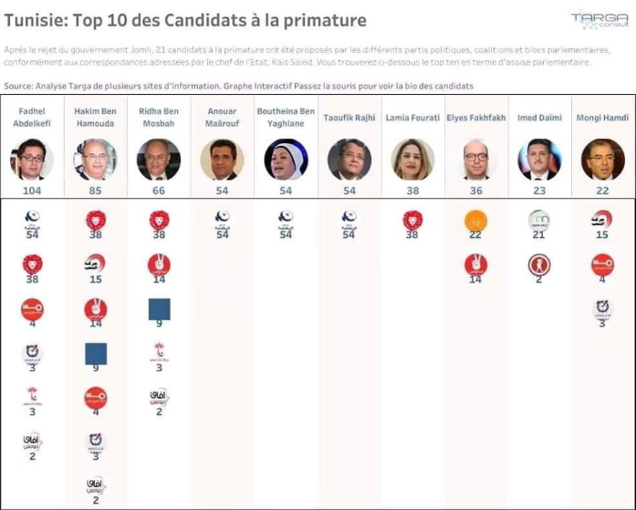 وفي مايلي ترتيب المرشّحين لرئاسة الحكومة وفق عدد الأحزاب الداعمة لهم: