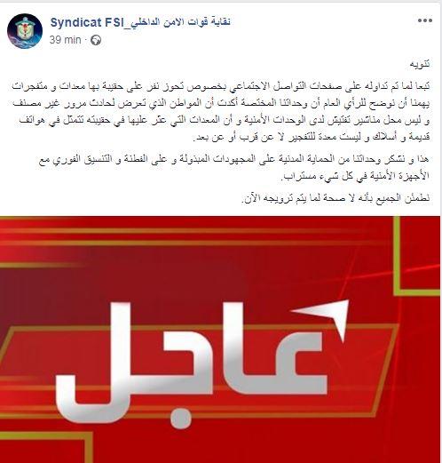 ووضّحت النقابة أنّ الوحدّات المختصة أكّدت أن المواطن الذي تعرّض لحادث مرور غّير مصنف و ليس محل مناشير تفتيش لدى الوحدات الأمنية و أن المعدات التي عثر عليها في حقيبته تتمثل في هواتف قديمة و أسلاك و ليست معدة للتفجير لا عن قرب أو عن بعد.